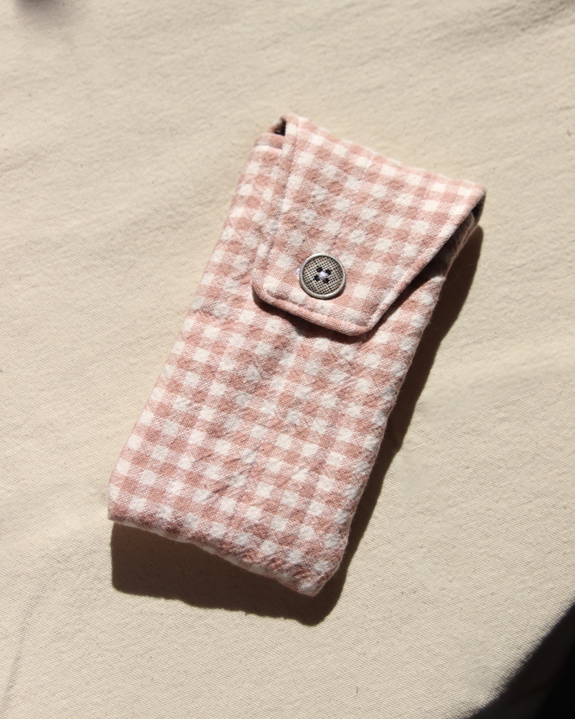 Carefully quilted sunglass pouch. Cotton outter fabric and filling and lining inside. The perfect cute accessory to protect your sunglasses from any scratches.